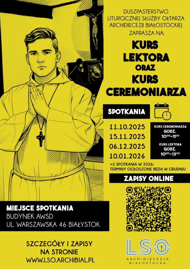 W sobotę 11 października 2025 r. o godzinie 10.00 w Archidiecezjalnym Seminarium Duchownym w Białymstoku (ul. Warszawska 46) rozpocznie się Kurs Lektora i Ceremoniarza. Adresatami kursu są mężczyźni i kobiety w wieku od 16 lat, charakteryzujący się pobożnością i naturalnymi predyspozycjami do pełnienia posługi lektora w zgromadzeniu liturgicznym. Podstawowe wymagania stawiane kandydatom i kandydatkom to odpowiednia dykcja i pismo uwierzytelniające od Księdza Proboszcza parafii zamieszkania. Zajęcia odbywać się będą w terminach: 11.10.2025 r., 15.11.2025 r., 06.12.2025 r., 10.01.2026 r. Koszt uczestnictwa, związany z organizacją zajęć to 150 zł.